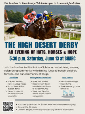 The Rotary Club of Sunriver-La Pine members invite you to The High Desert Derby: An Evening of Hats, Horses & Hope.